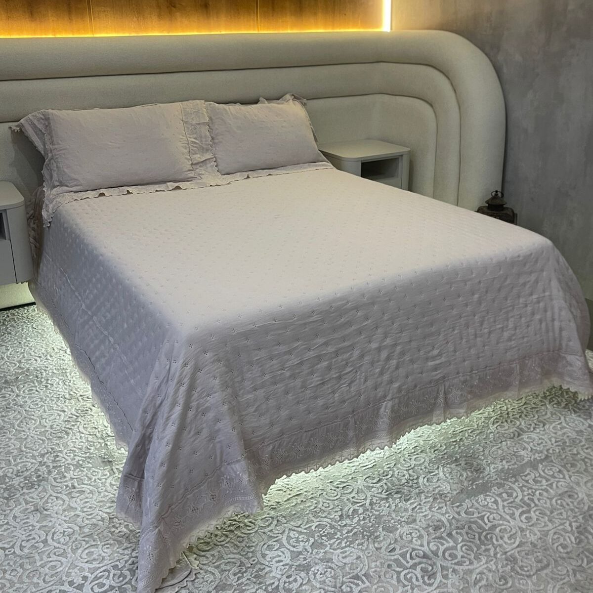 Adicione charme e sofisticação ao seu quarto com este lindo conjunto com acabamento em Bordado Inglês. Confeccionado em 100% poliéster, oferece toque macio, caimento leve e alta durabilidade, sendo ideal para o uso diário.